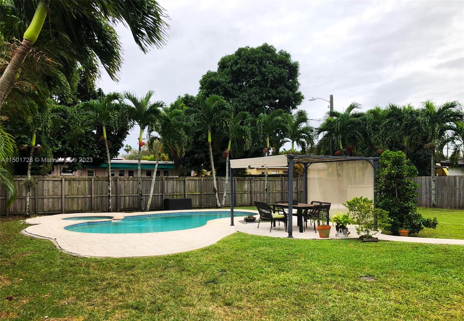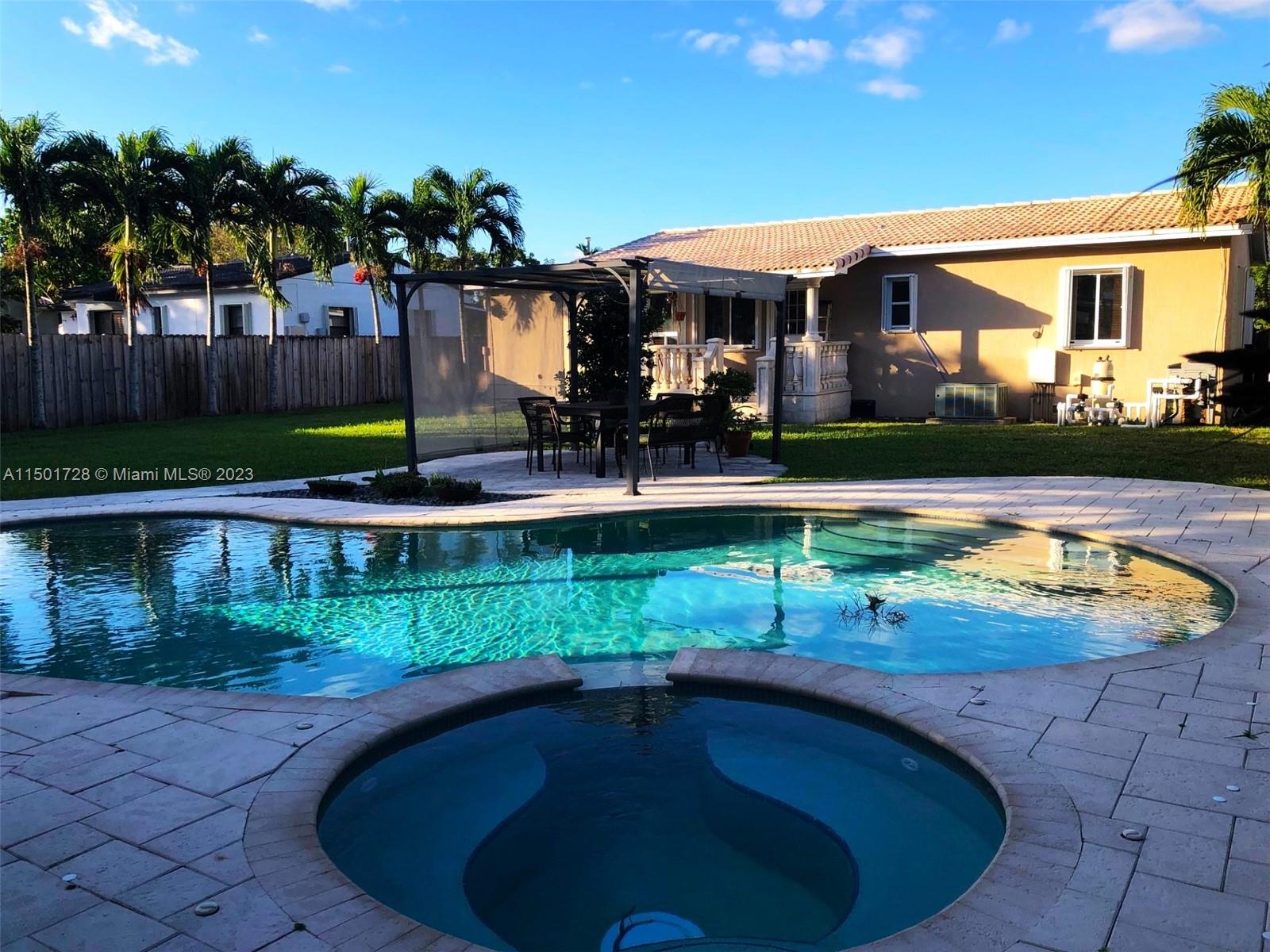 Lowest priced 3/2 pool home for rent in Miami Springs! Interior features include wood and tile floors, updated bathrooms, a separate laundry room, and a tankless water heater. The spacious kitchen offers stainless steel appliances, including a gas stove, granite countertops, and pullup bar for casual eating. The kitchen overlooks an expansive, private fenced backyard featuring a sparkling pool with jacuzzi, and a canopied dining/lounge area great for entertaining day or night. Near schools, parks, shops, restaurants, and boutique businesses in historical Downtown Miami Springs. Easy access to Miami International Airport, City Place Doral, and major expressways. Rent includes pool and lawn maintenance. No smoking and no pets.