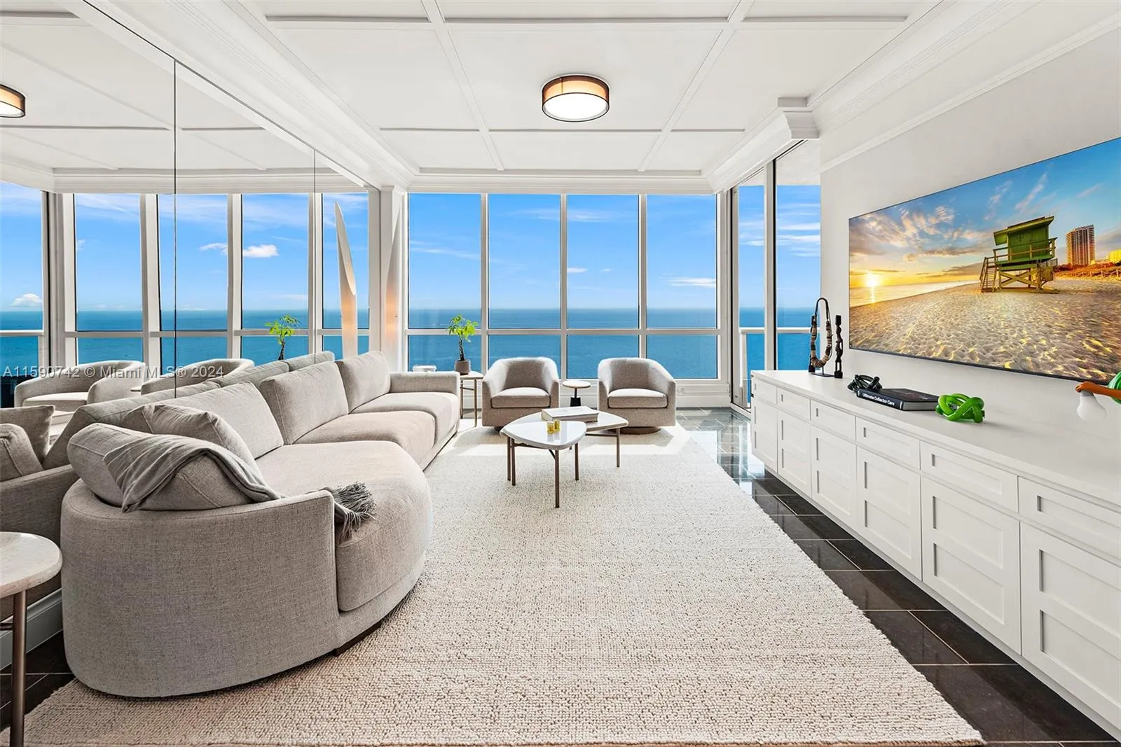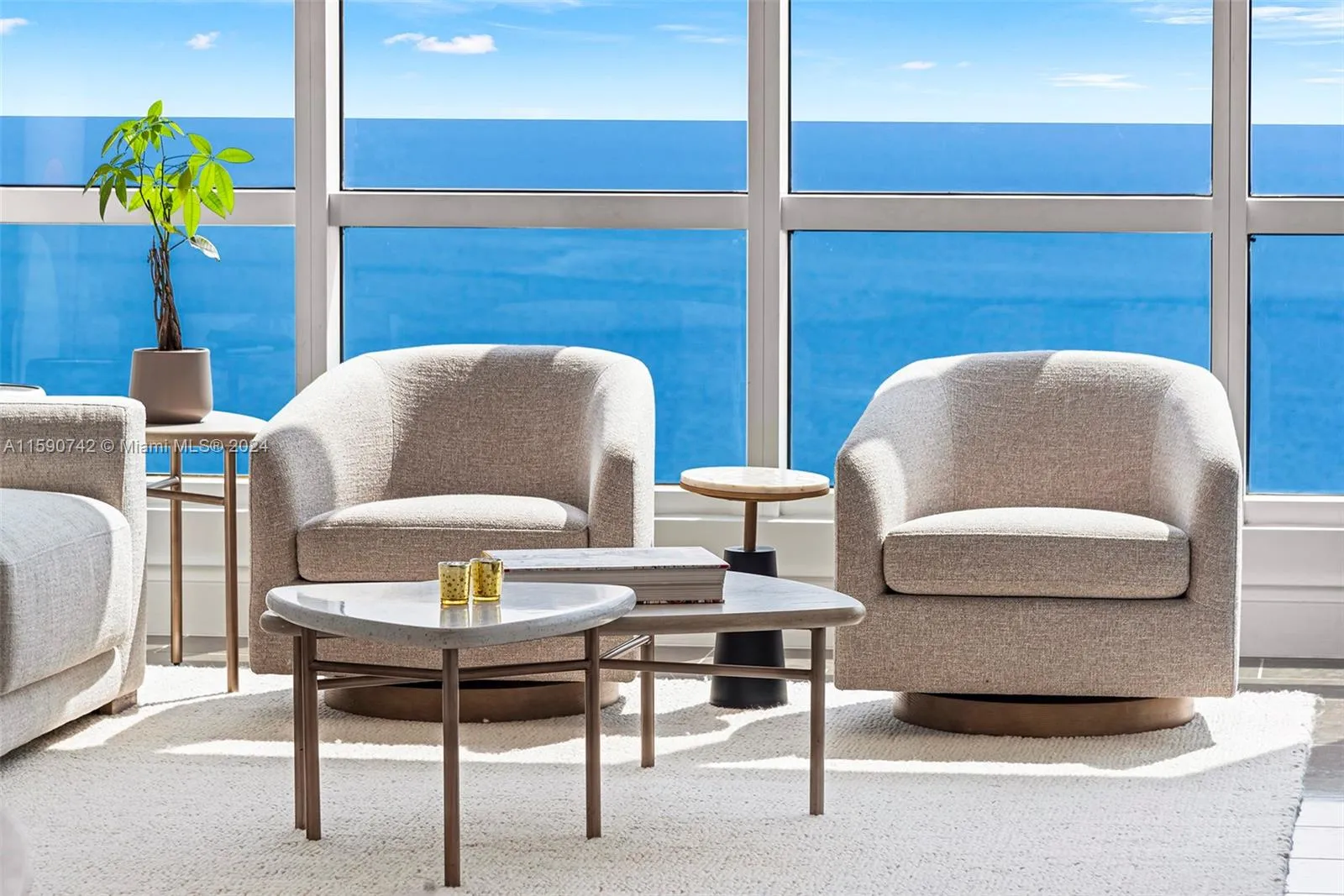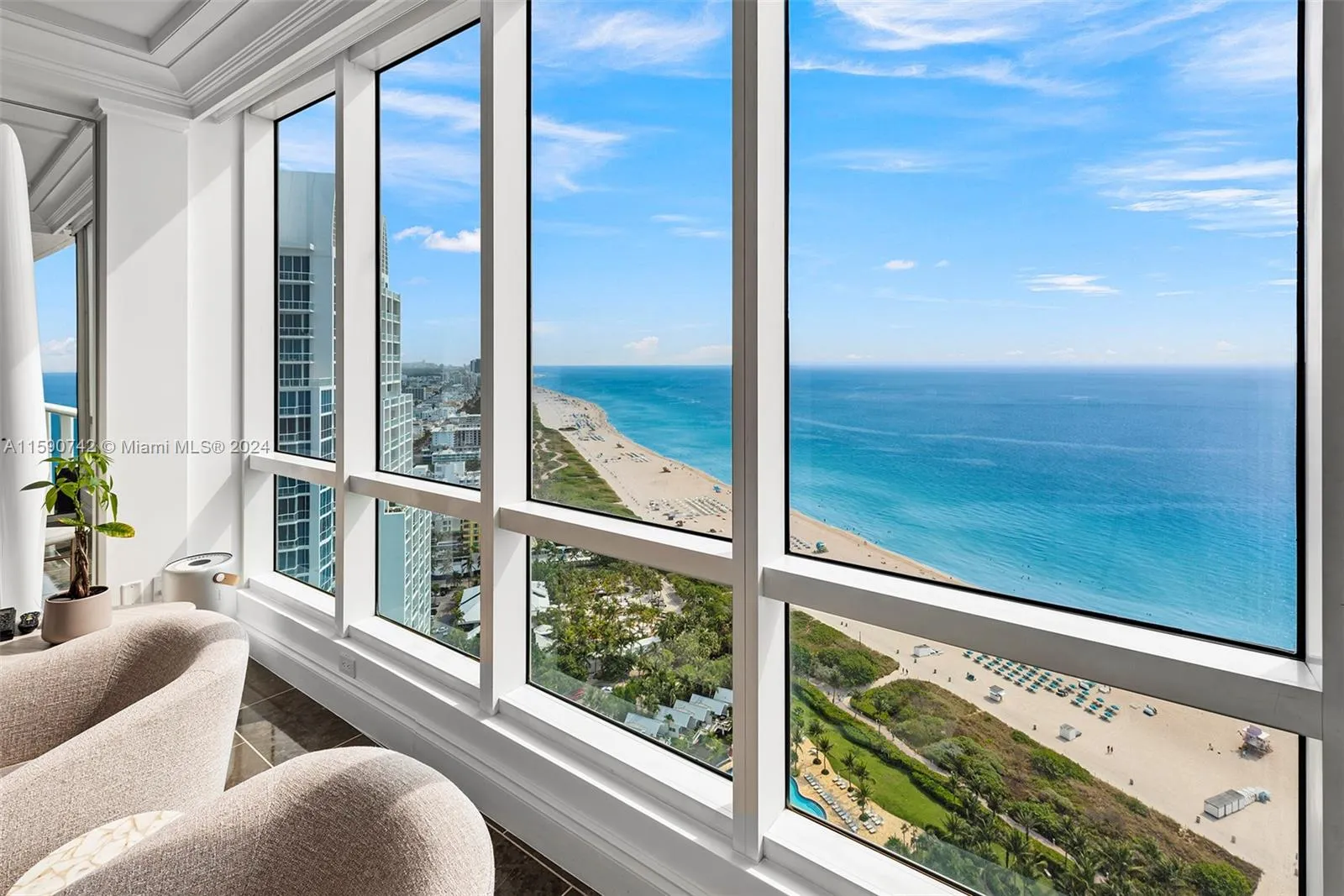 Exquisite upgraded interior design was just unveiled! Enter through an inviting private lobby into the turnkey furn. luxe condo and be mesmerized by pristine ocean views, S. Pointe Park and the Miami Beach ArtDeco skyline. Begin everyday with magical sunrises from anywhere in the home. Step outside to your terrace and relax on lounges capturing vistas form Pointe Beach all the way beyond Sunny Isles. New open kitchen features new Subzero, architectural lighting, quartz counters and streamline sink with matt-black fixtures. Large formal dining features bar area and climate controlled wine vault perfect for entertaining. Formal living features elegant built-ins, custom lighting and coffered ceilings. Principal suite features sitting area, millwork, spa bath w/floating tub +new WI closet.