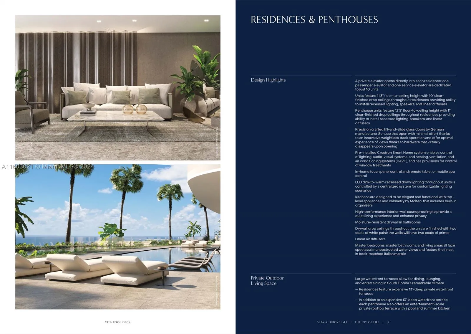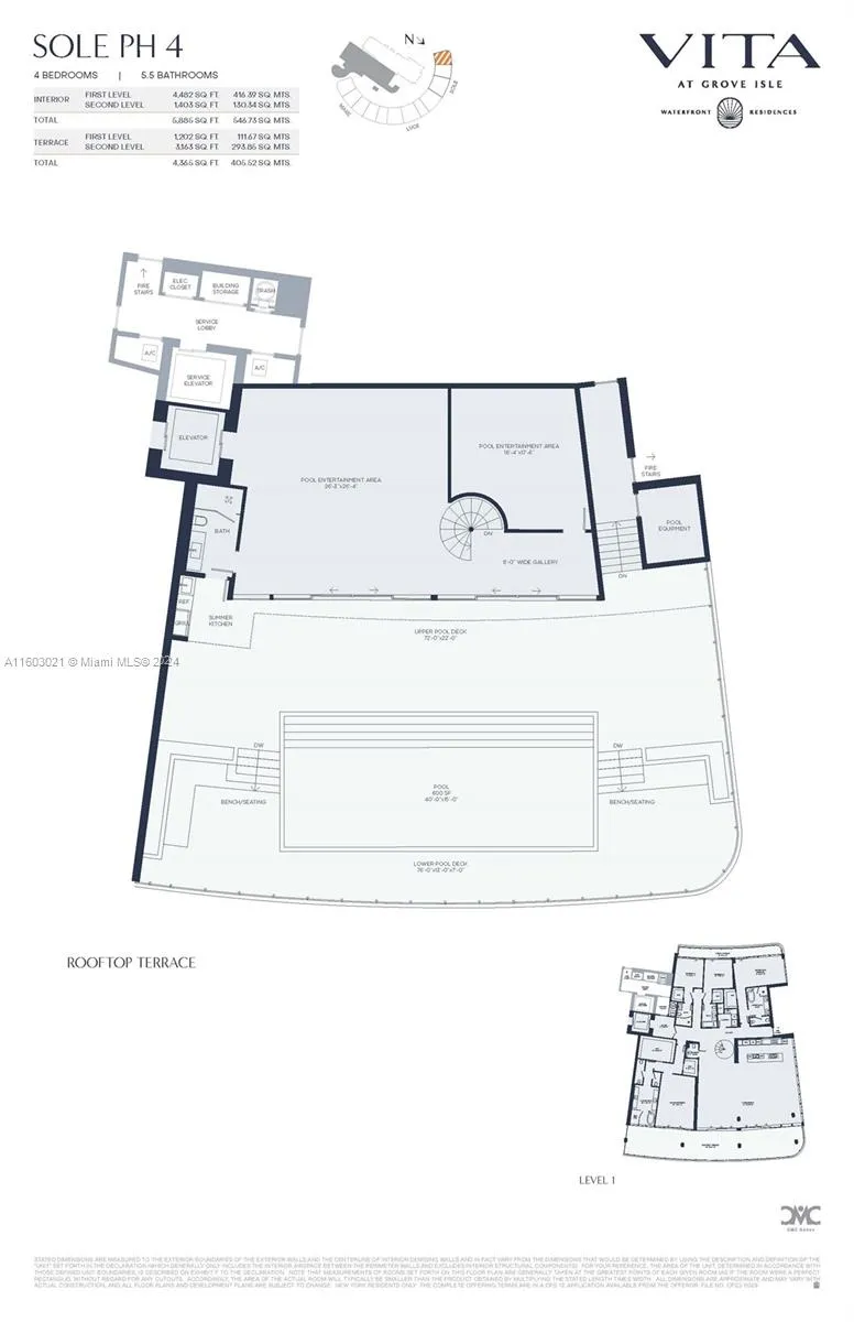 Penthouse Sole 04 in VITA AT GROVE ISLE – an exclusive waterfront sanctuary of 65 condominium residences on a private island will be delivered end of 2025. The 2-story Penthouse is bathed in natural light coming through floor-to-ceiling windows with 11’ ceilings that frame panoramic Biscayne Bay views. A private pool, 40’ x15’, surrounded by a spectacular rooftop garden features a summer kitchen and a large air conditioned rooftop space. Extensive exclusive amenities: Clubhouse, restaurant, tennis courts, pickleball, padel & much more. The unique floor plan flow, the smart home function to the selection of marbles at Italian quarries is personally overseen by the developer. This sophisticated residential condominium is developed by the renowned luxury developer, Ugo Colombo of CMC Group.
