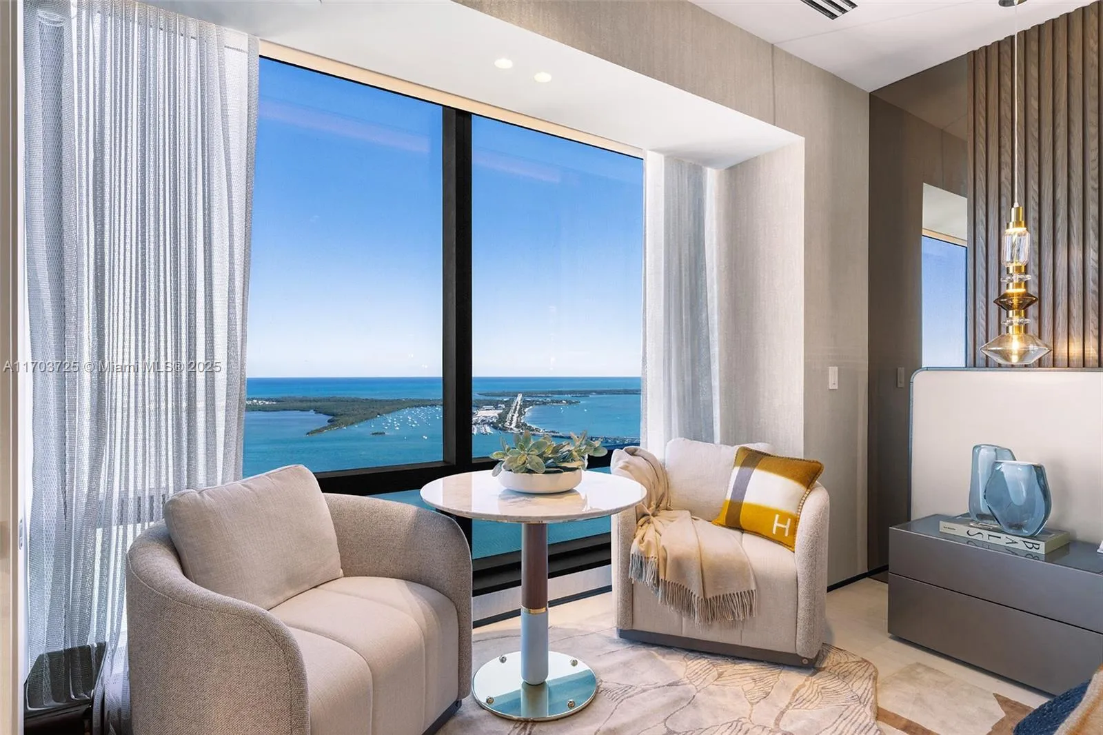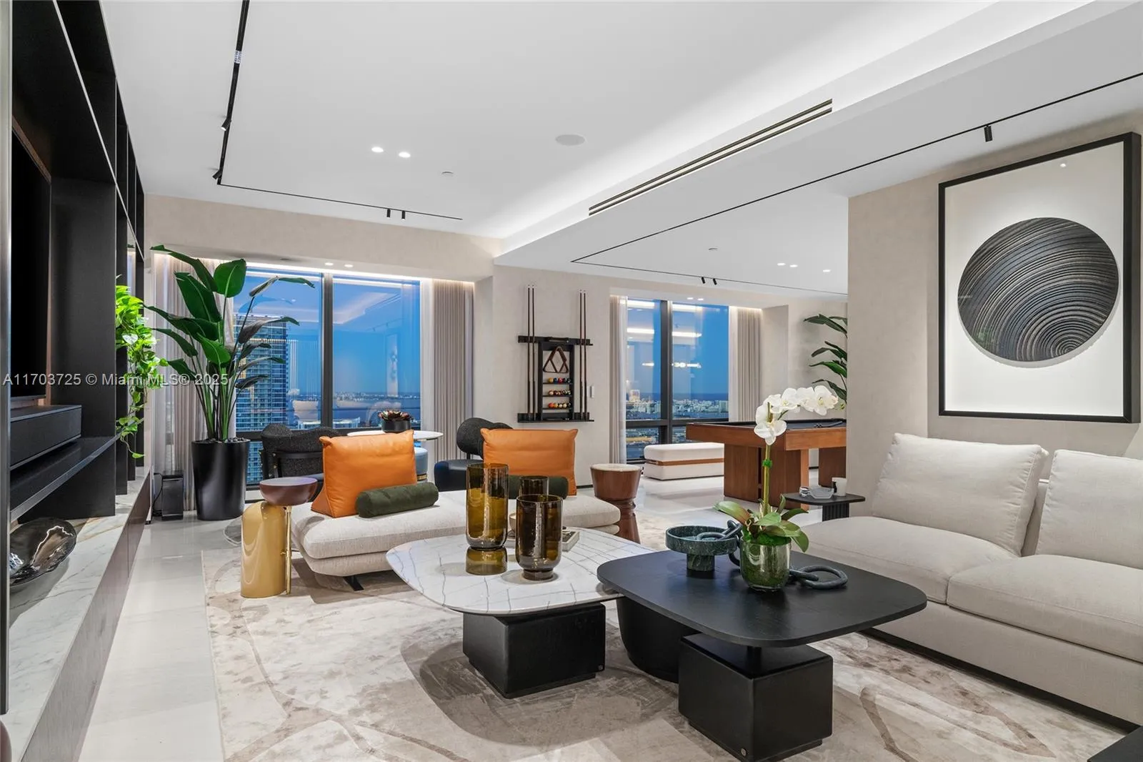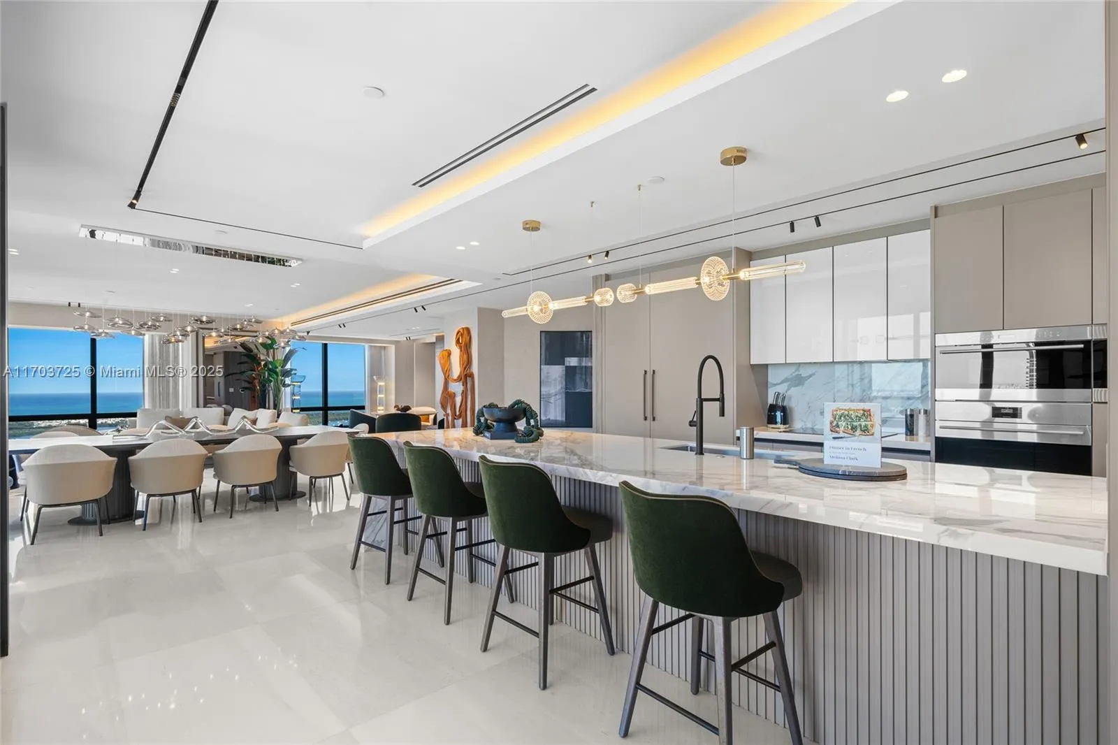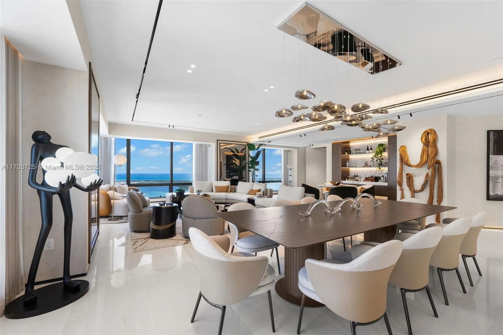 Welcome to Lower Penthouse 66. This fully renovated turnkey masterpiece in the prestigious Four Seasons Residences is situated on the 66th floor, in the building’s most desirable lines, D & E. This residence seamlessly merges two units, offering panoramic ocean and city views from every room. The interiors exude sophistication with Bianco Ondulato marble floors and an Ornare kitchen featuring Calacatta countertops. Furnished by Fendi, Minotti, and Luxury Living. Spa-like bathrooms with Armani fixtures, LED-lit recessed baseboards, gunmetal accents, and smart home technology. Ideal for entertaining, the home includes a lounge, bar, private office, family room, and maid’s quarters. World-class amenities include an Equinox fitness center, spa, multiple pools, and 24-hour concierge services
