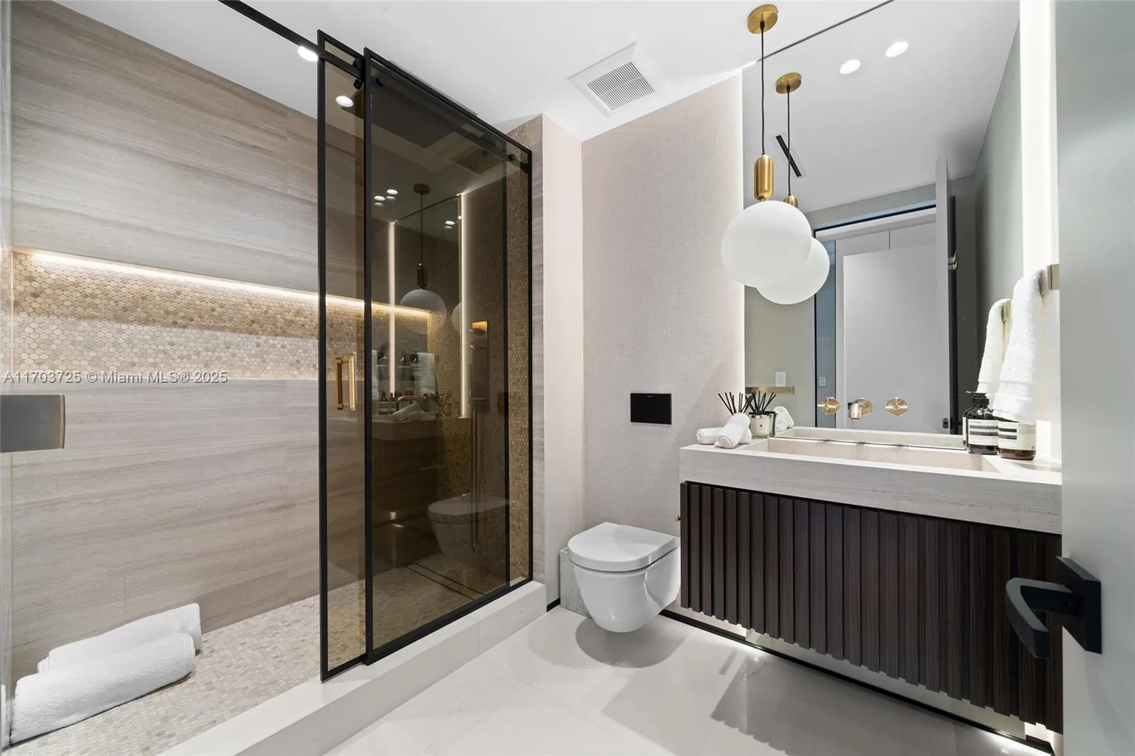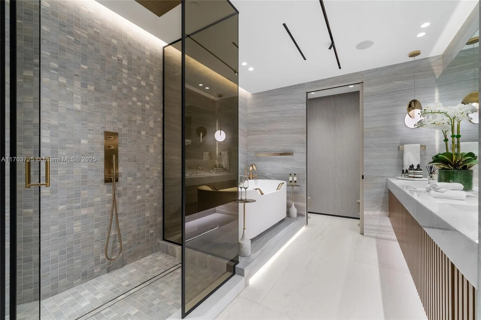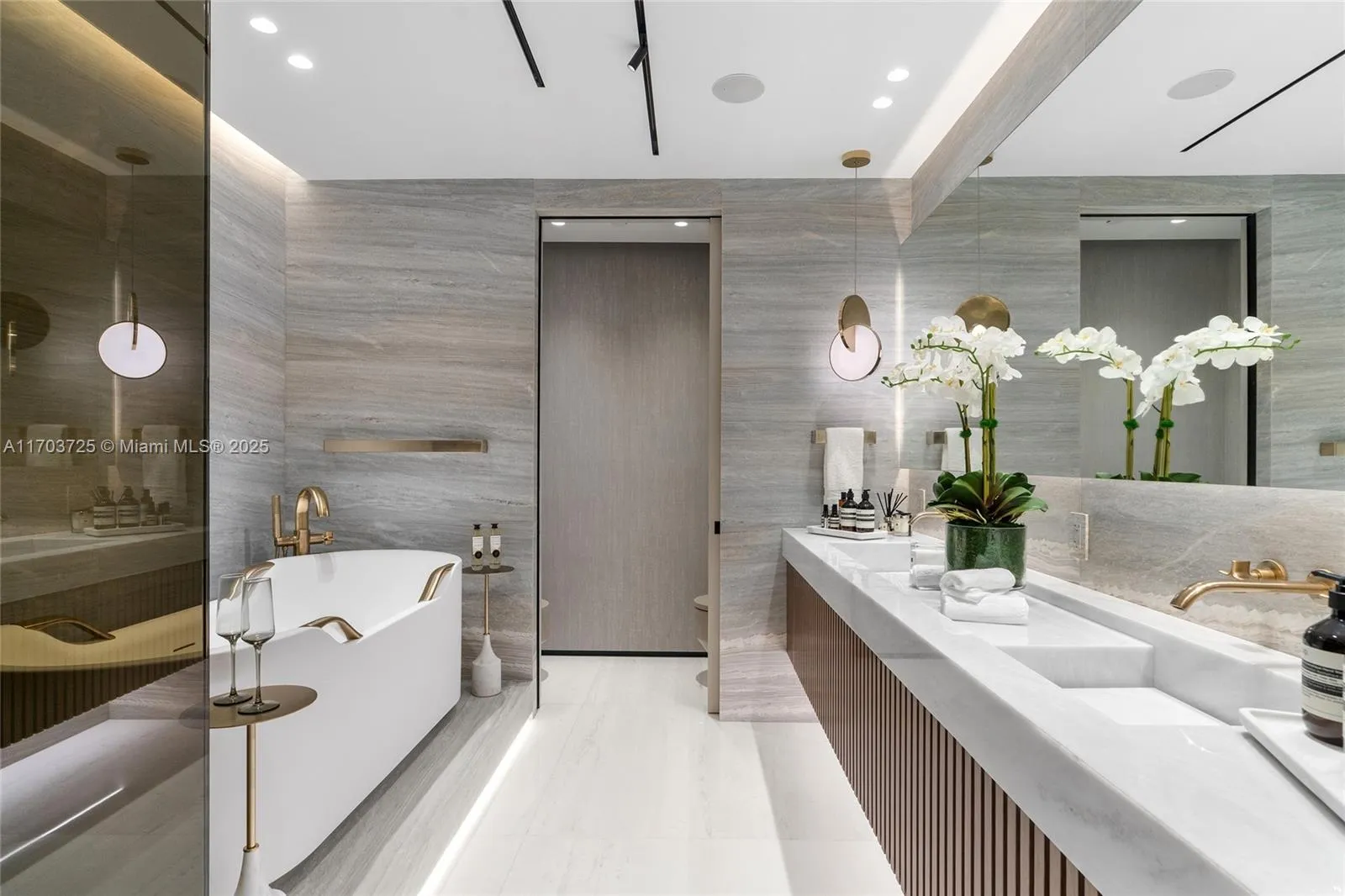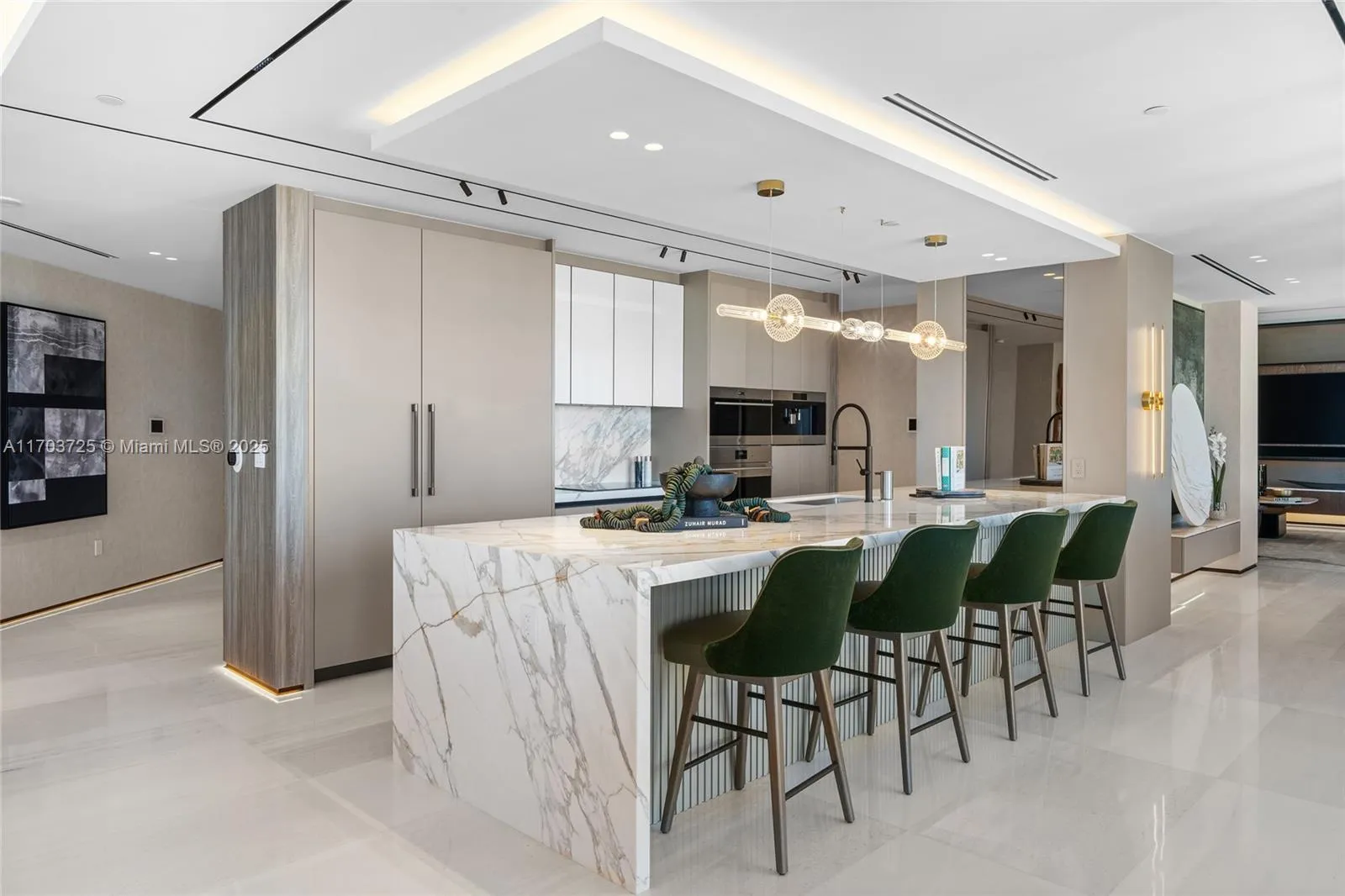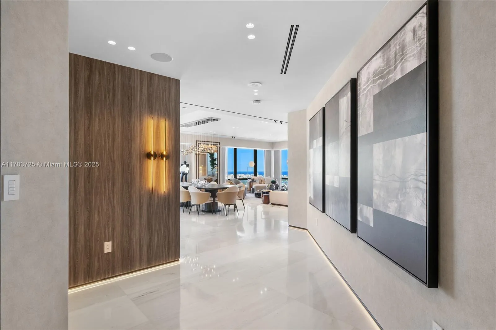 Welcome to Lower Penthouse 66. This fully renovated turnkey masterpiece in the prestigious Four Seasons Residences is situated on the 66th floor, in the building’s most desirable lines, D & E. This residence seamlessly merges two units, offering panoramic ocean and city views from every room. The interiors exude sophistication with Bianco Ondulato marble floors and an Ornare kitchen featuring Calacatta countertops. Furnished by Fendi, Minotti, and Luxury Living. Spa-like bathrooms with Armani fixtures, LED-lit recessed baseboards, gunmetal accents, and smart home technology. Ideal for entertaining, the home includes a lounge, bar, private office, family room, and maid’s quarters. World-class amenities include an Equinox fitness center, spa, multiple pools, and 24-hour concierge services
