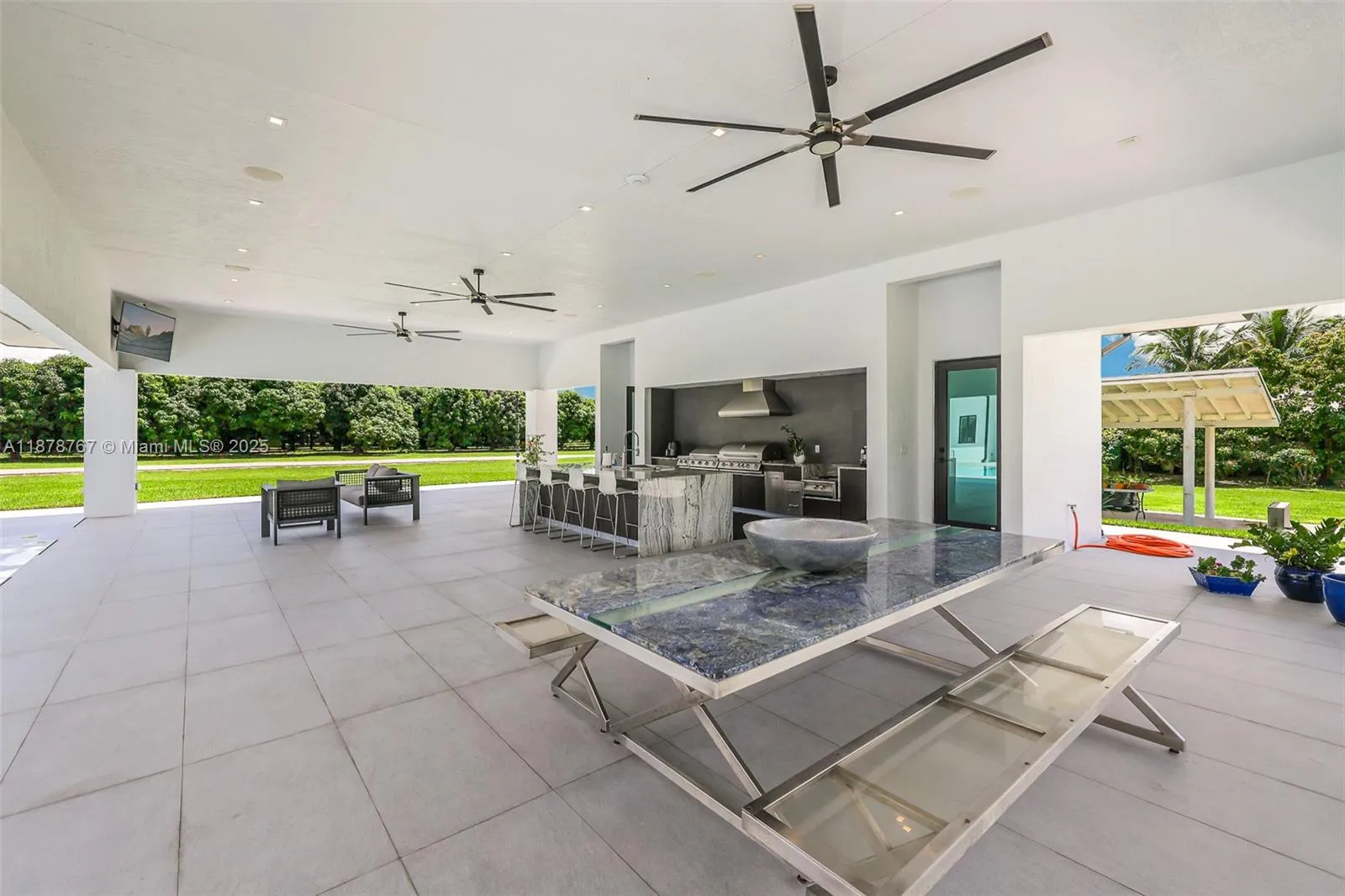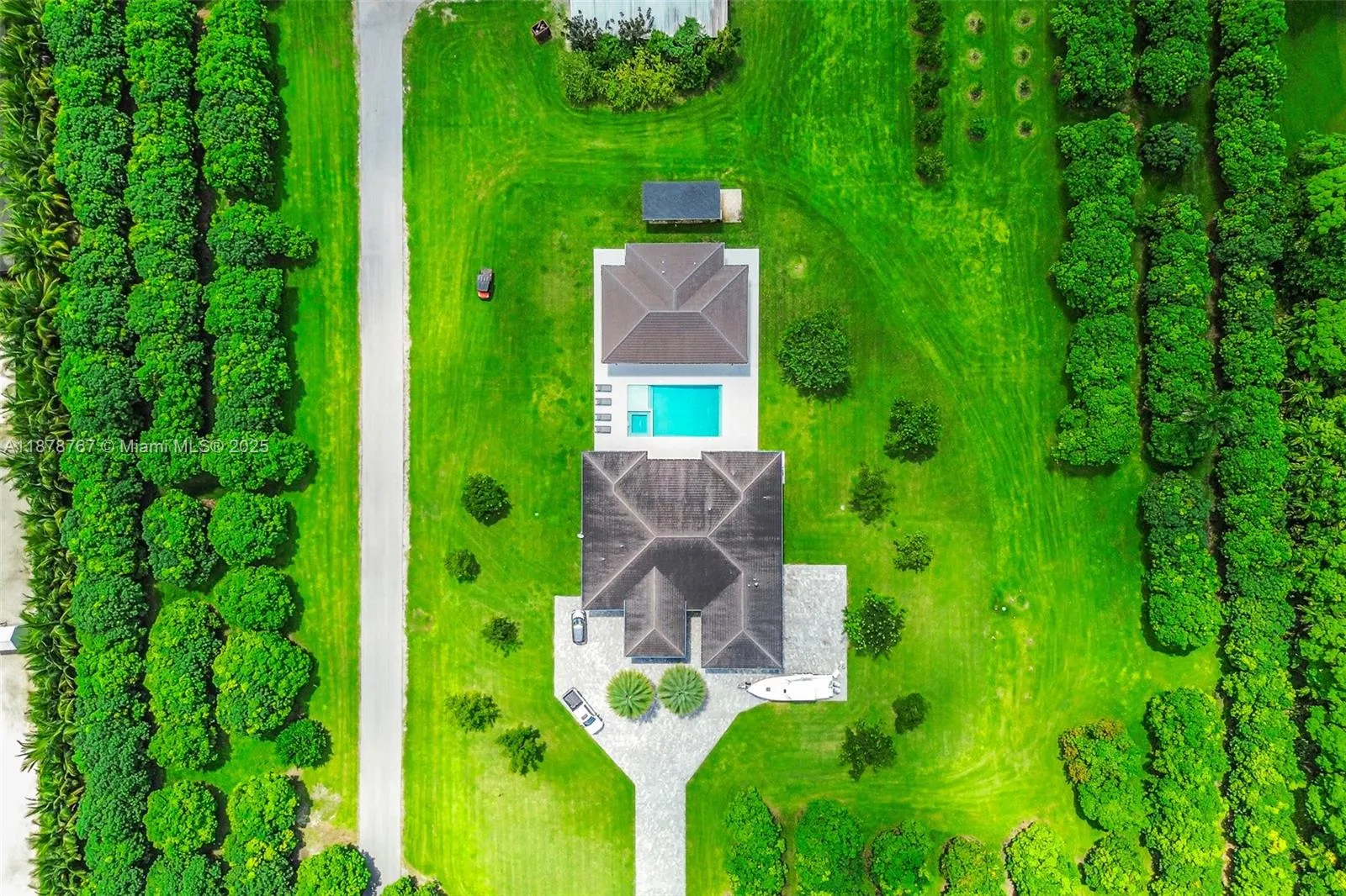 Unique and exquisite 7.5-acre estate featuring a newly built custom residence with soaring 12-ft ceilings, 8-ft doors, and an open-concept design with oversized island, chef ready high-end appliances, and more. Each room offers a private bath and walk-in closet. Outdoors, enjoy a stunning gazebo with a full chef’s kitchen and bath, a double-car garage, and a covered barn for all agricultural needs. The meticulously maintained grounds include 300+ mango trees generating income and more. Gated paved access with ample space for luxury vehicles, boats, RVs, etc. This estate also features a commercial-grade power meter ready for expansion. Every corner of the 7.5 acres has been perfectly cared for and is ready to enjoy. Come see it for yourself.