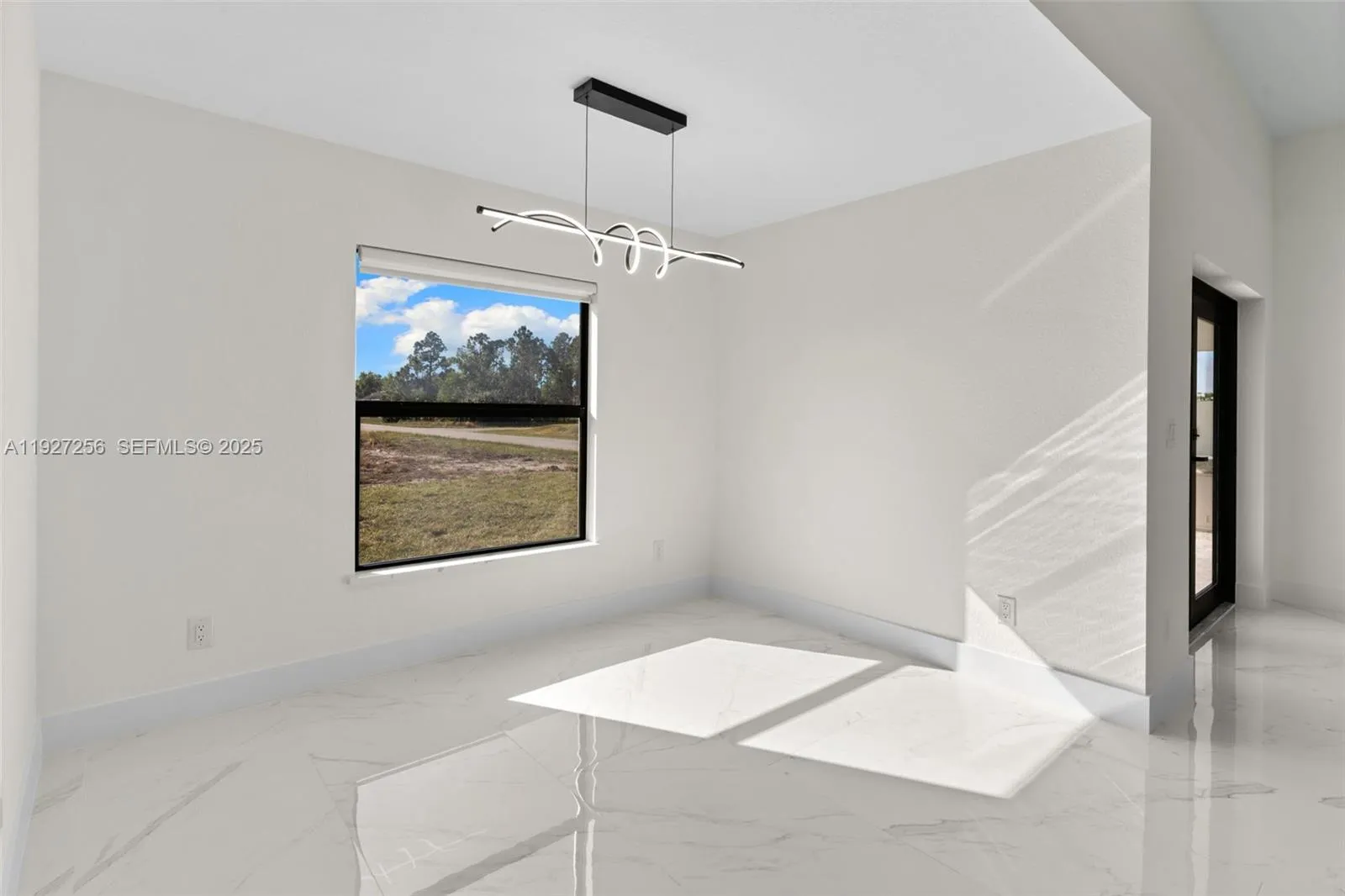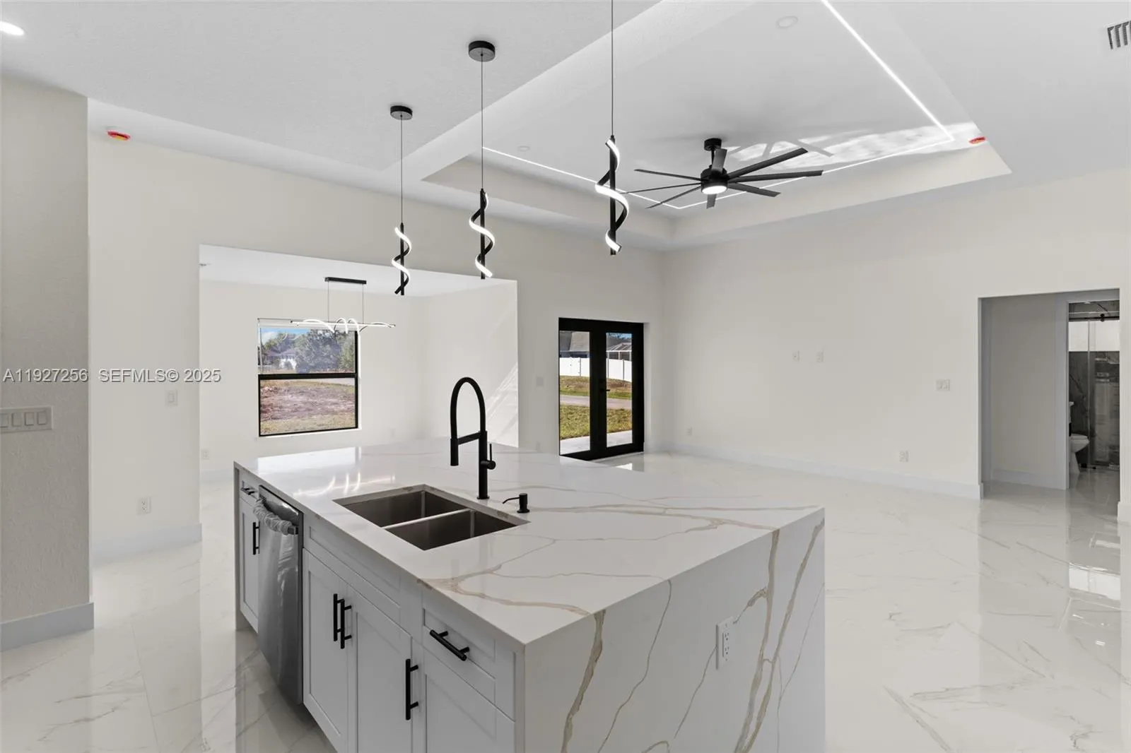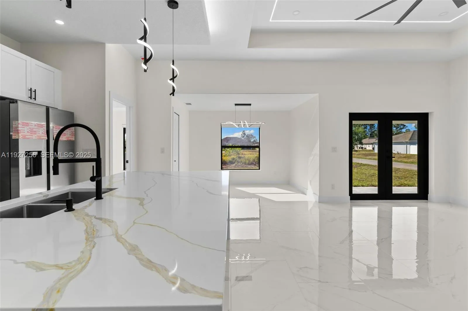 Welcome to this beautifully designed brand-new construction home located in the highly desirable Southwest Lehigh Acres. Offering 4 spacious bedrooms and 2 elegant bathrooms, this modern residence blends luxury, comfort, and functionality in every detail. Step into a bright open-concept floor plan featuring glossy porcelain tile throughout, soaring ceilings with a designer tray ceiling and LED lighting, and a striking modern ceiling fan that elevates the main living space. The gourmet kitchen is a true showstopper with quartz countertops, sleek white cabinetry, stainless steel appliances, and contemporary pendant lighting, perfect for both everyday living and entertaining. The primary suite offers a private retreat with a spa-inspired bathroom, showcasing a large glass-enclosed walk-in shower with premium tile, dual-sink vanity, and elegant black fixtures. Generously sized secondary bedrooms provide flexibility for family, guests, or home office space. Enjoy outdoor living with ample room to create your dream backyard oasis. Situated on a quiet street with new construction surrounding, this home offers peace of mind and modern Florida living at its finest. No HOA | Minutes from schools, dining, shopping, and major roadways. This is a must-see opportunity in one of Lehigh Acres’ fastest-growing areas!