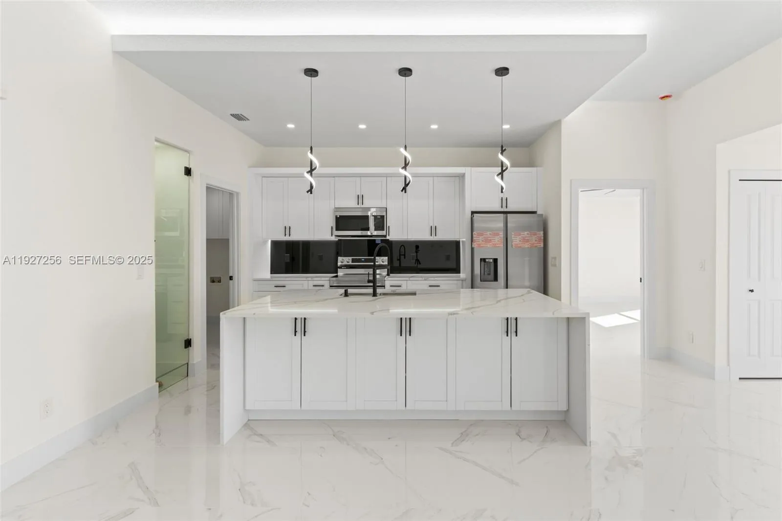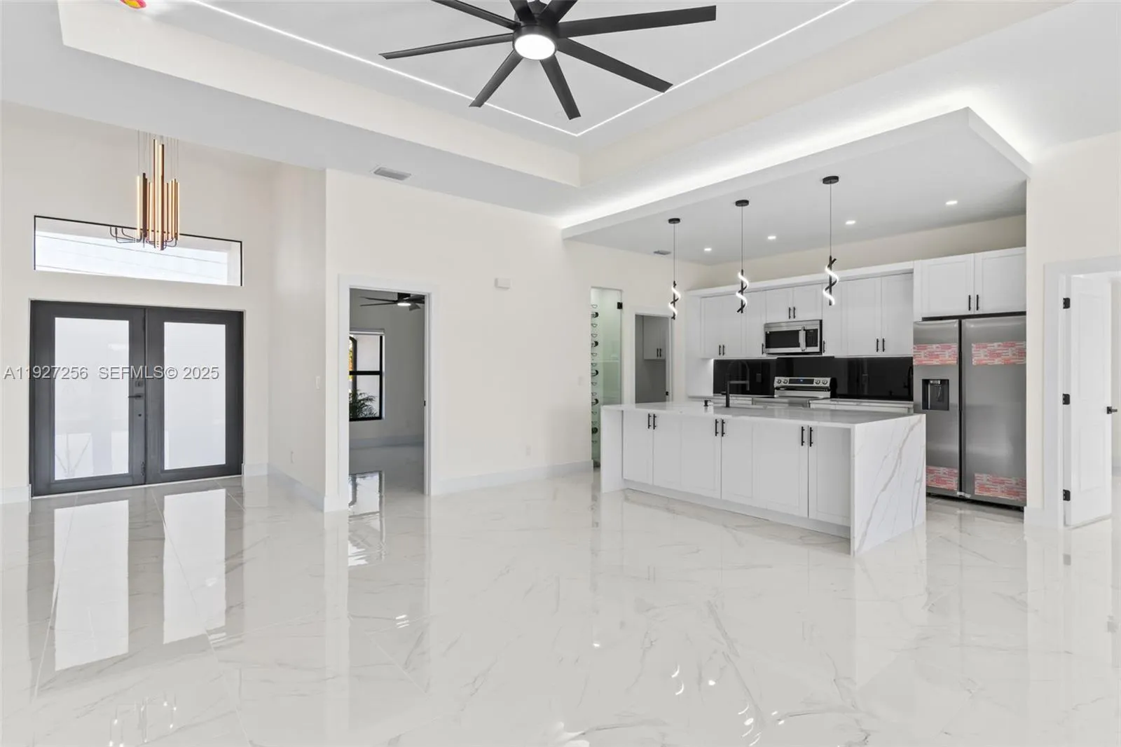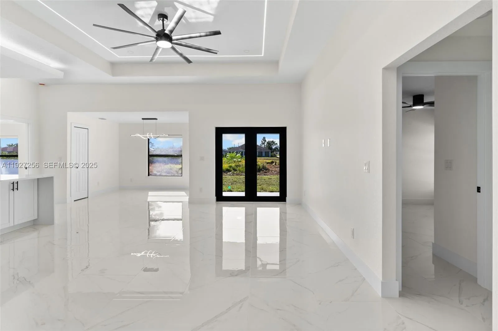 Welcome to this beautifully designed brand-new construction home located in the highly desirable Southwest Lehigh Acres. Offering 4 spacious bedrooms and 2 elegant bathrooms, this modern residence blends luxury, comfort, and functionality in every detail. Step into a bright open-concept floor plan featuring glossy porcelain tile throughout, soaring ceilings with a designer tray ceiling and LED lighting, and a striking modern ceiling fan that elevates the main living space. The gourmet kitchen is a true showstopper with quartz countertops, sleek white cabinetry, stainless steel appliances, and contemporary pendant lighting, perfect for both everyday living and entertaining. The primary suite offers a private retreat with a spa-inspired bathroom, showcasing a large glass-enclosed walk-in shower with premium tile, dual-sink vanity, and elegant black fixtures. Generously sized secondary bedrooms provide flexibility for family, guests, or home office space. Enjoy outdoor living with ample room to create your dream backyard oasis. Situated on a quiet street with new construction surrounding, this home offers peace of mind and modern Florida living at its finest. No HOA | Minutes from schools, dining, shopping, and major roadways. This is a must-see opportunity in one of Lehigh Acres’ fastest-growing areas!